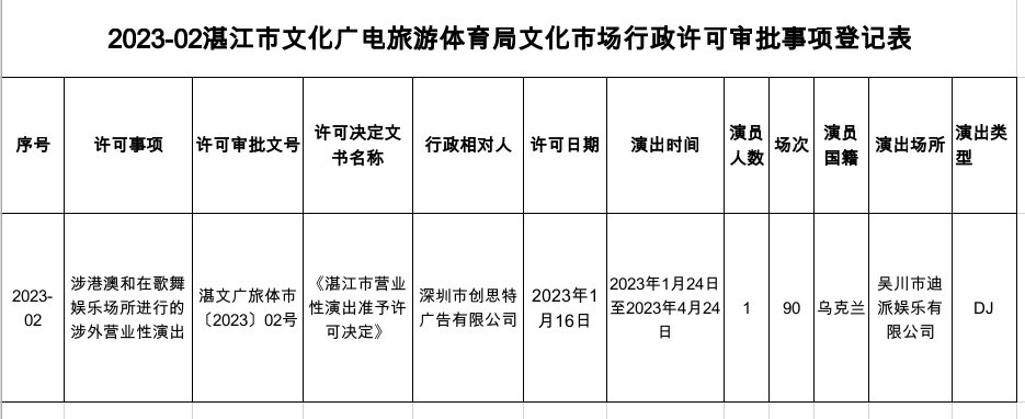 2023-02湛江市文化广电旅游体育局文化市场行政许可审批事项登记表