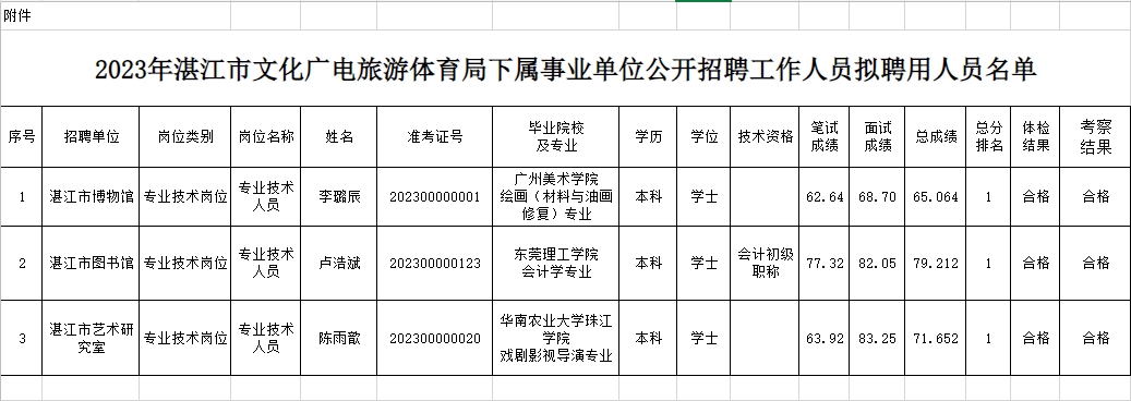 2023年湛江市文化广电旅游体育局下属事业单位公开招聘工作人员拟聘用人员公示
