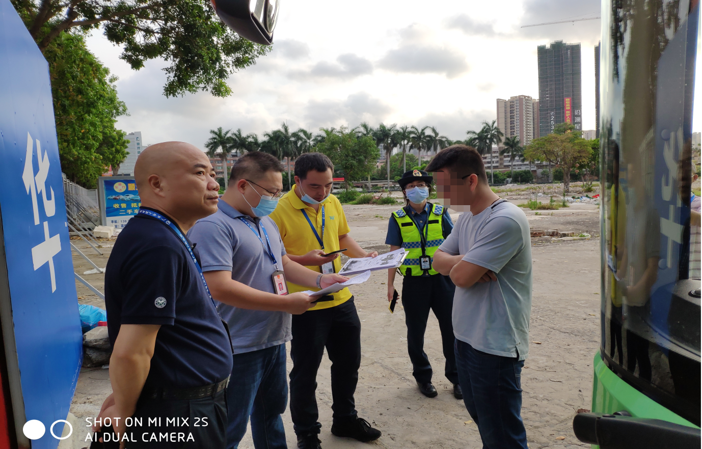 (图为:交通运输执法人员对北海籍旅游大巴车辆进行制作现场检查笔录和调查取证)