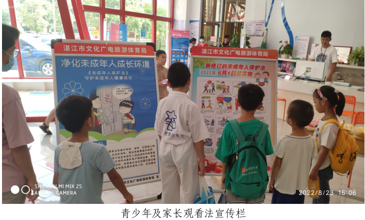 近日,湛江市文广旅体局普法志愿服务队带着普法宣传栏、普法资料来到湛江市青少年宫开展法治宣传教育活动。本次法治宣传活动的主题为“关爱未成年人,优化成长环境”,重点对《中华人民共和国未成年人保护法》进行普法宣传,并结合我局工作实际,对防范未成年人沉迷网络开展宣传教育。