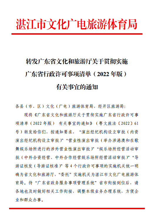 转发广东省文化和旅游厅关于贯彻实施广东省行政许可事项清单(2022年版) 有关事宜的通知
