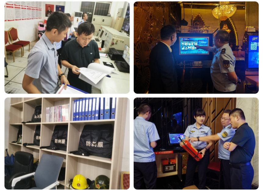 图为检查组检查娱乐场所经营日志是否完备、点唱曲库是否存在违禁曲目;消防设施配备等情况
