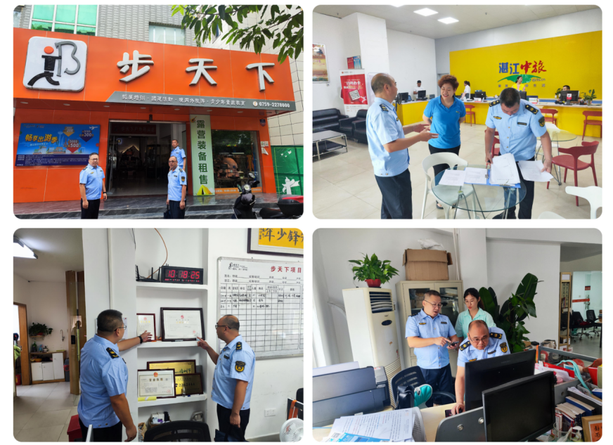 图为执法人员检查旅行社经营资质并抽查旅游电子合同,同时强调旅游包车“五不租”原则确保旅游行程安全