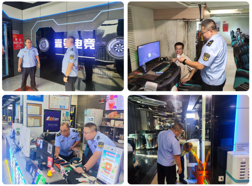 图为执法人员检查网吧安装“文网卫士”情况及现场抽查上网人员身份证,杜绝接待未成年人进入消费的违法行为