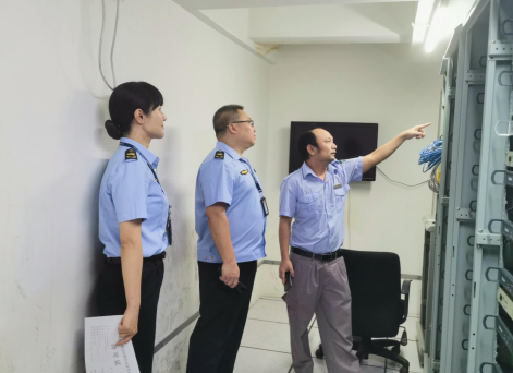 图为检查组认真检查该星级酒店卫星接收设备机房管理及运行情况