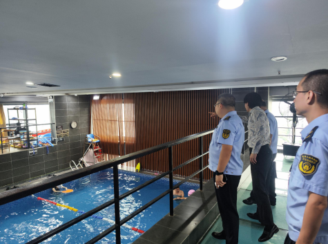 检查组一行严格按照《全民健身条例》、《经营高危险性体育项目许可管理办法》的相关要求,重点检查游泳场所是否证照齐全并上墙公示;救生员、教练员是否按照规定配备并持证上岗;救生员是否佩戴能标明其身份的醒目标识;救生器材、急救设备是否配备充分;警示标识标牌是否按照规定设置;各类安全生产管理制度是否齐全并张贴于醒目位置。