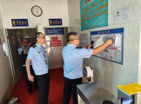 图为执法人员检查游泳场所更衣区域消防设备配置情况