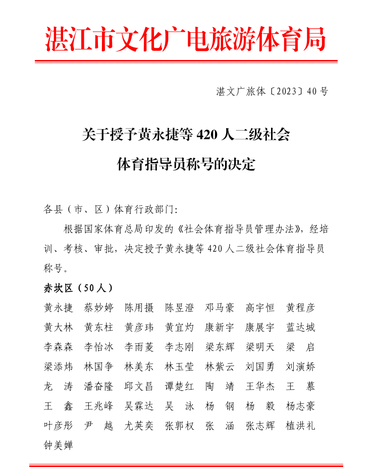 关于授予黄永捷等420人二级社会体育指导员称号的决定