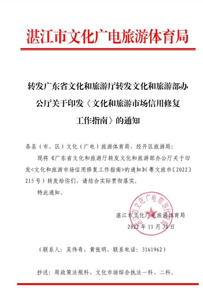转发广东省文化和旅游厅转发文化和旅游部办公厅关于印发《文化和旅游市场信用修复工作指南》的通知