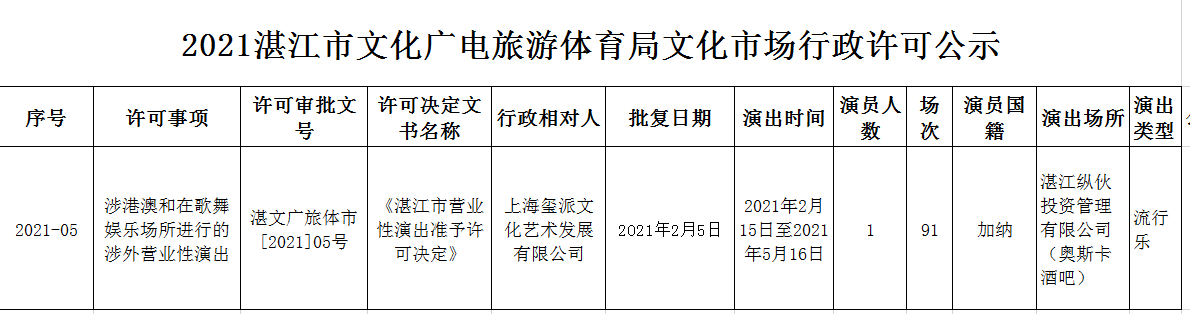 2021湛江市文化广电旅游体育局文化市场行政许可公示(2021.2.6)