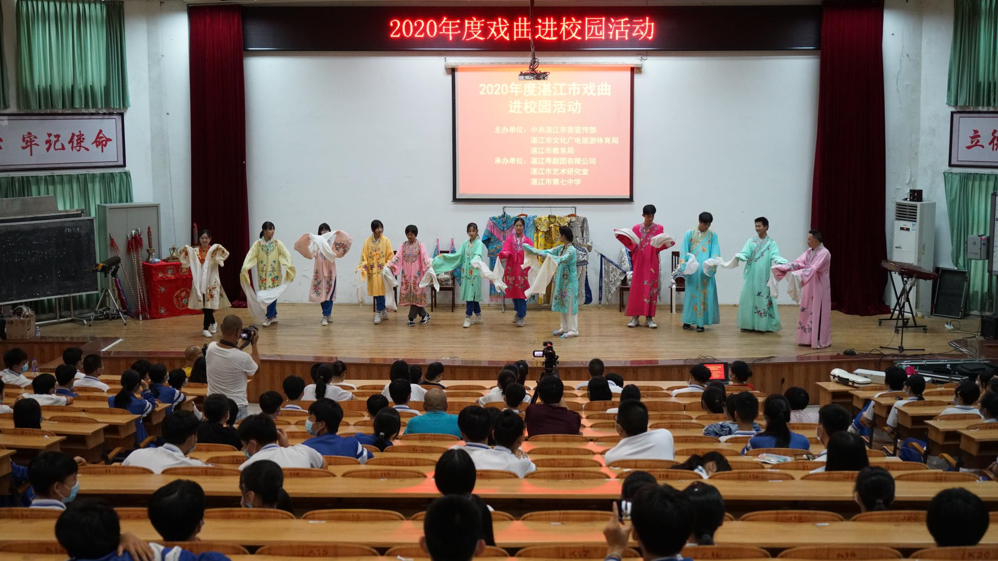 7月30日下午,2020年湛江市戏曲进校园活动走进湛江市第七中学,网剧《隐秘角落》拍摄地。本次课程的主讲是湛江市粤剧团有限公司副经理郑建平及其团队,主题为“领略粤剧之美”。郑老师从程式舞蹈之美、音乐唱腔之美、文学韵律之美三个方面向七中师生讲述戏曲艺术的综合特征和南派粤剧的地方特色,并结合湛江市粤剧团有限公司演员的演出,教授戏曲小知识,教学戏曲简单程式,教唱粤剧经典唱段。
