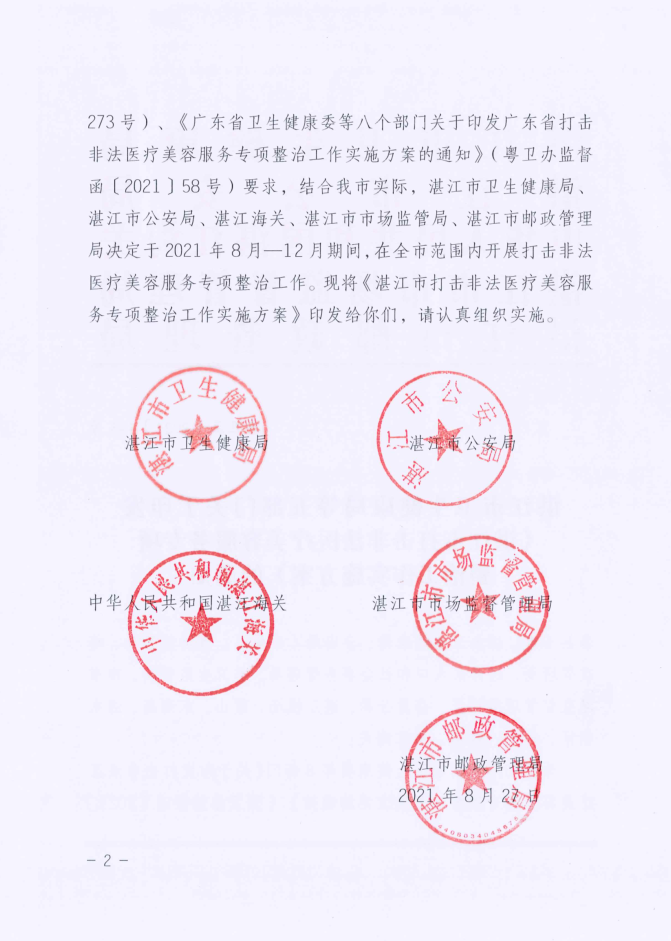 湛江市卫生健康局等五部门关于印发湛江市打击非法医疗美容服务专项整治工作实施方案的通知(湛卫函〔2021〕445号)