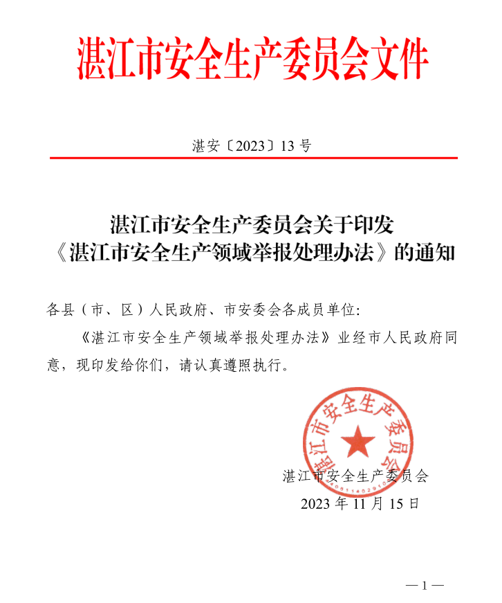 湛江市安全生产委员会关于印发《湛江市安全生产领域举报处理办法》的通知.pdf