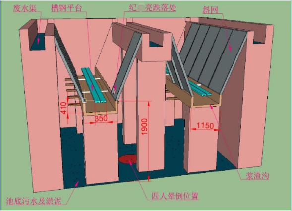 因捞浆作业通道过窄、平台防护栏杆缺失,纪某亮在捞浆作业时不慎跌落集水池(有限空间),集水池内氧气含量不足,纪某生、纪某翔和王某法盲目涉水进入池内施救,池底污泥搅动后释放出硫化氢和一氧化碳,四人窒息、中毒后晕倒在污水中淹溺,抢救无效死亡。