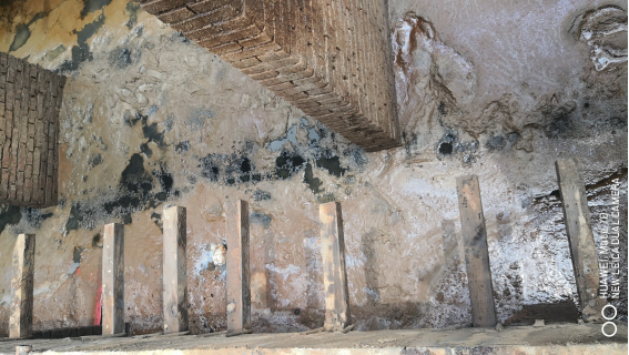 经现场勘查和气体检测,浆渣收集区域作业通道及集水池未检测出有毒气体,在旁边未发生事故的集水井检测出微量氨气。事发时纪某亮在通道进行斜网清洗作业,作业及通道平台宽0.35米,渣浆沟深0.4米,沟面敞开无防护,通道没有设置防护栏。纪某亮身高1.71米,现场斜网穿破口中心位于斜网边框上方0.5米处,由此可以排除纪某亮从槽钢平台或渣浆沟直接跌落集水池的可能;渣浆沟深0.4米,技术组推断,纪某亮在西侧起第6块斜网处脚踏空踩入渣浆沟、身体失去平衡后侧倒落入积水池。斜网穿破情况如图13所示。
