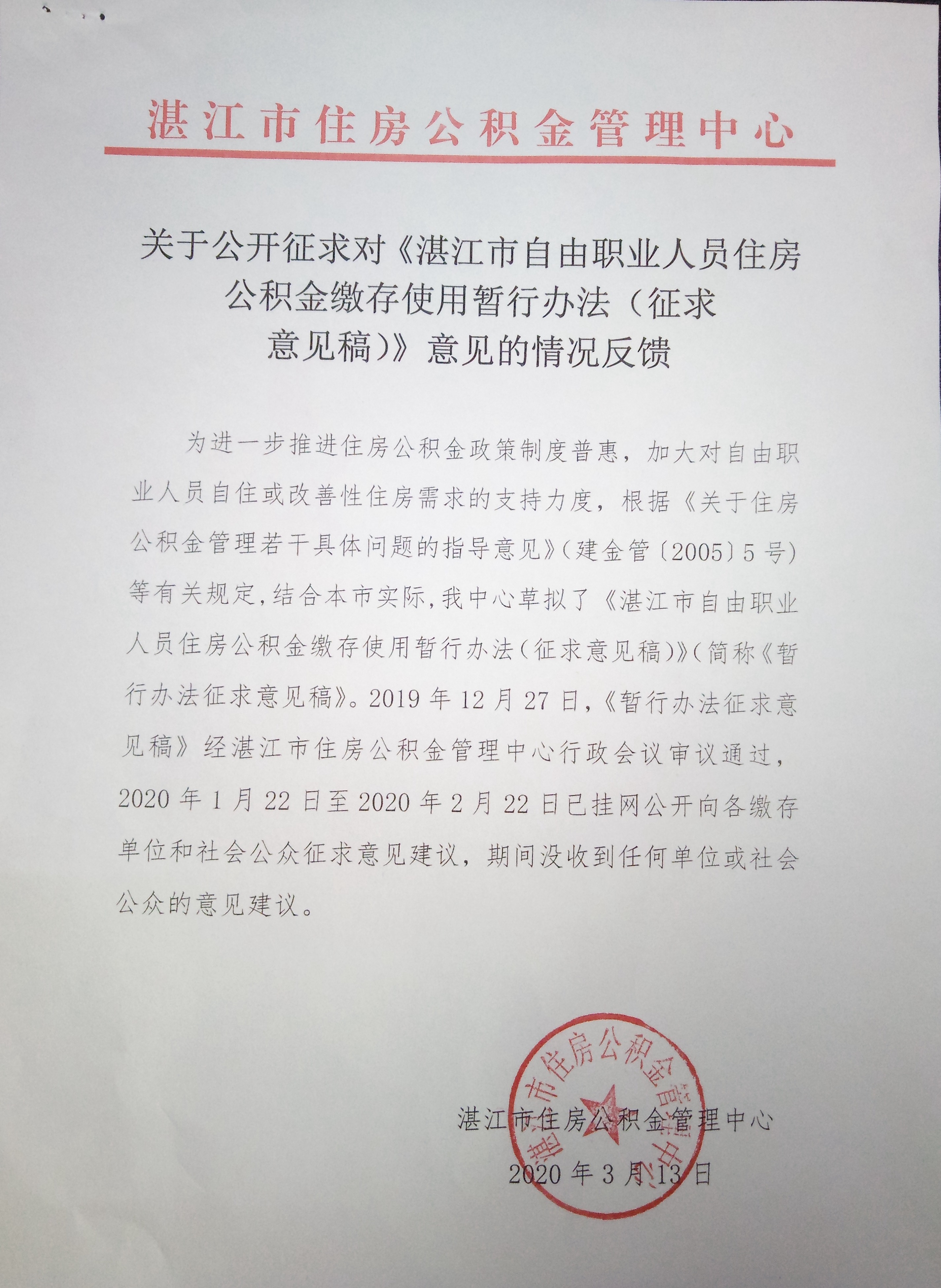 关于公开征求对《湛江市自由职业人员住房公积金缴存使用暂行办法(征求意见稿)》意见的通知