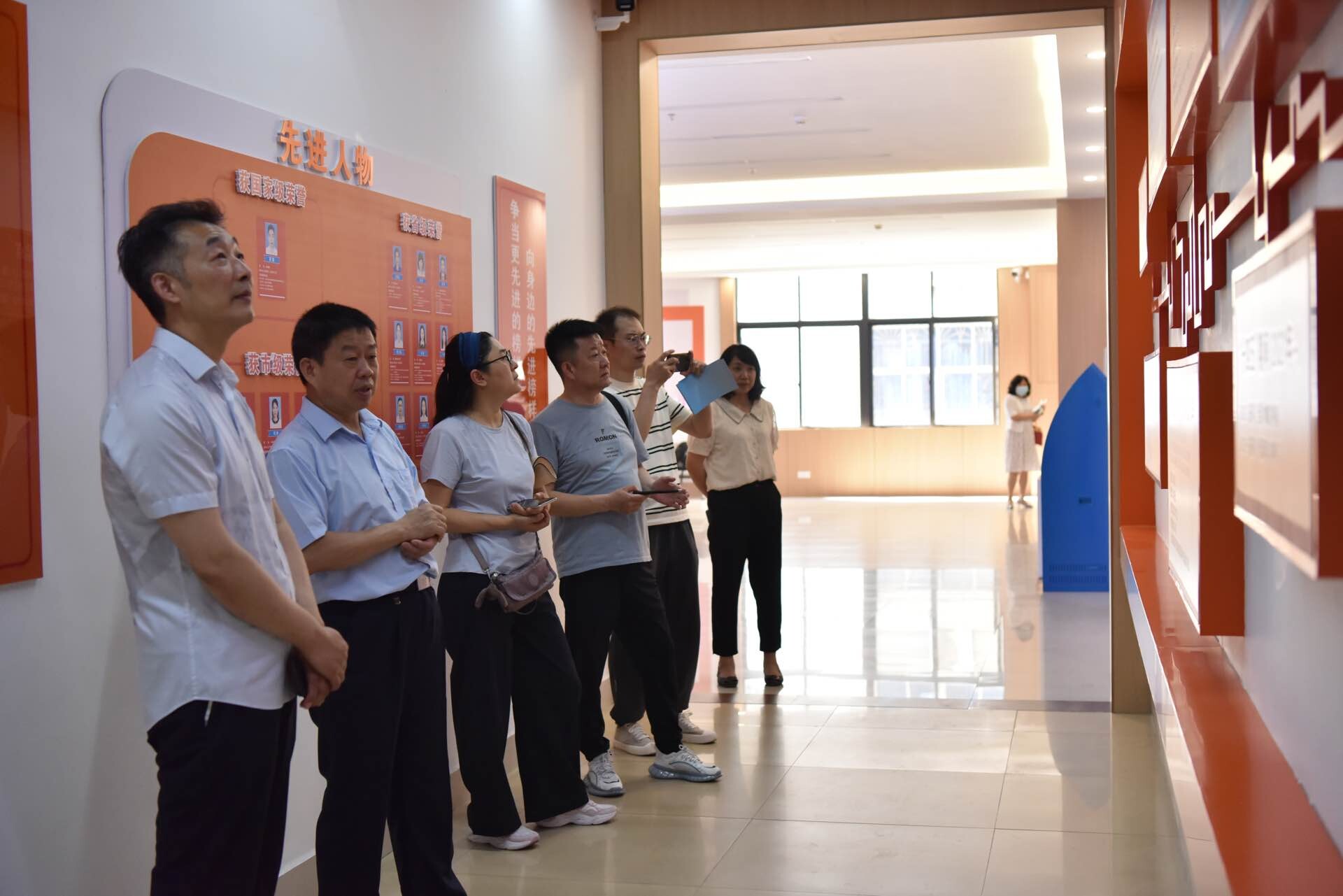 杨霁同志一行在市中心党组成员、副主任王琳的陪同下,先后参观了市中心服务大厅、图书阅览室、党建阵地等,到业务科室与业务骨干交流。在参观过程中,王琳同志当起了讲解员,为杨霁同志一行讲解了市中心的“六大特色党建”和“六大特色服务”等特色亮点工作。