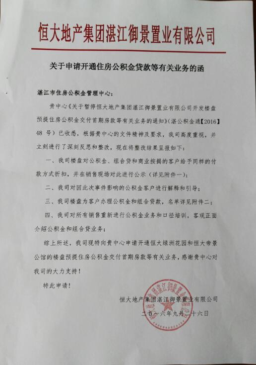 贵司《关于申请开通住房公积金贷款等有关业务的函》已收悉。贵司在回函表示,对我中心《关于暂停恒大地产集团湛江御景置业有限公司开发楼盘预提住房公积金交付首期房款等有关业务的通知》(湛公积金通〔2016〕48号)所提的意见高度重视,并按要求进行了深刻反思和整改,同时申请恢复住房公积金贷款等有关业务。