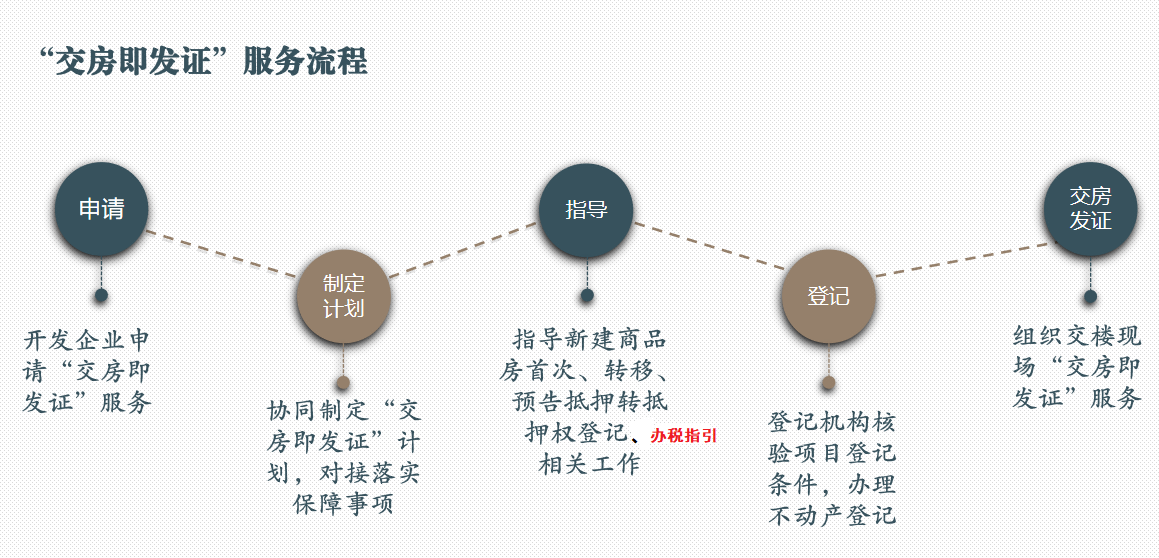 “交房即发证”服务,采取专项服务、专人对接、有序开展的模式,即市不动产登记中心受理开发企业相关申请,首次登记业务室和一手转移业务室专人对接指引开发企业“交房即发证”服务,协助开发企业制定“交房即发证”服务计划,落实相关保障,同时,协同税务部门一起现场指导购房人手机操作纳税以及首次登记、转移登记、预告抵押转持证抵押登记网上申请,共同提供“交房即发证”服务。