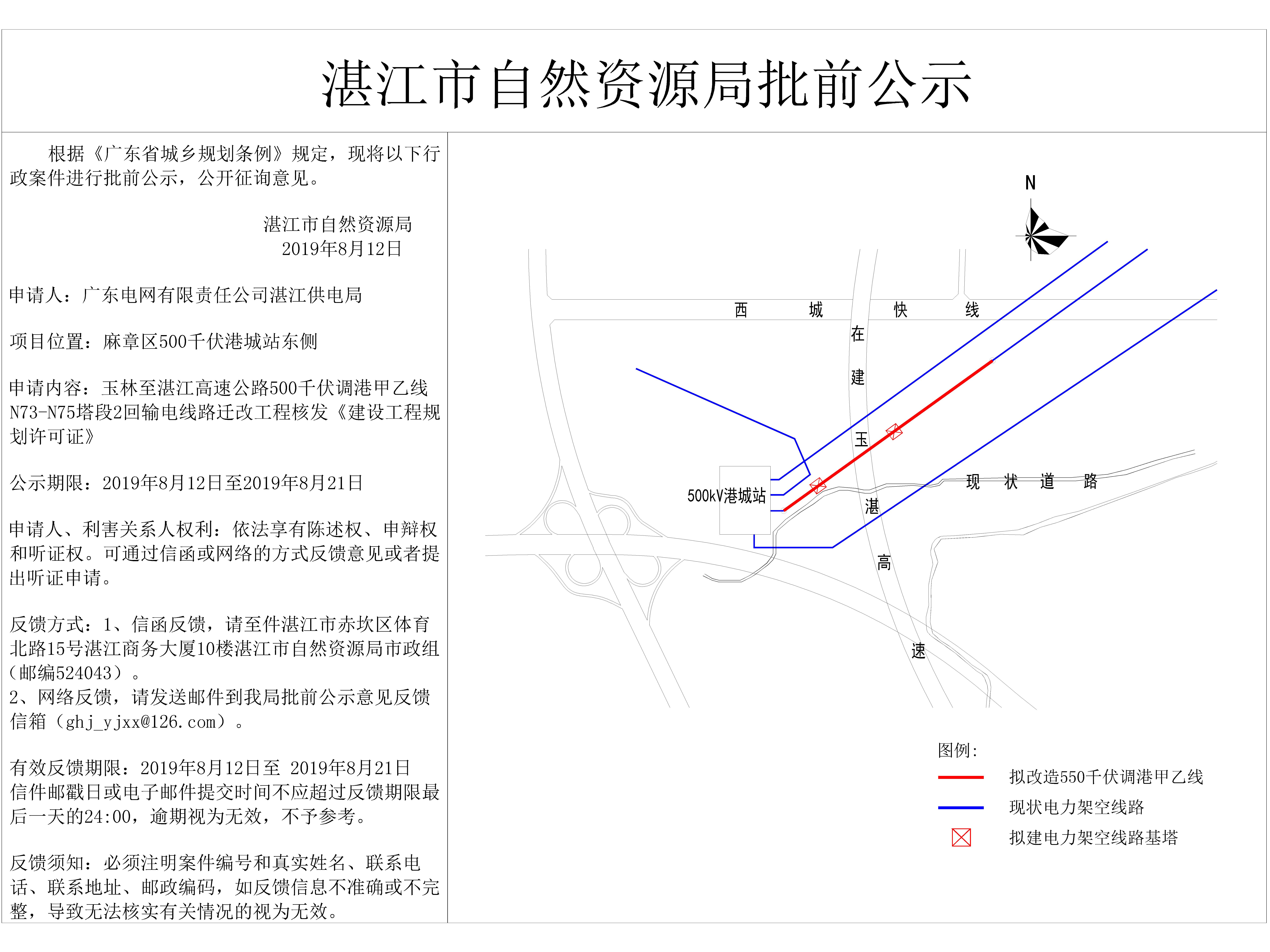 玉林至湛江高速公路500千伏调港甲乙线N73-N75塔段2回输电线路迁改工程核发《建设工程规划许可证》批前公示