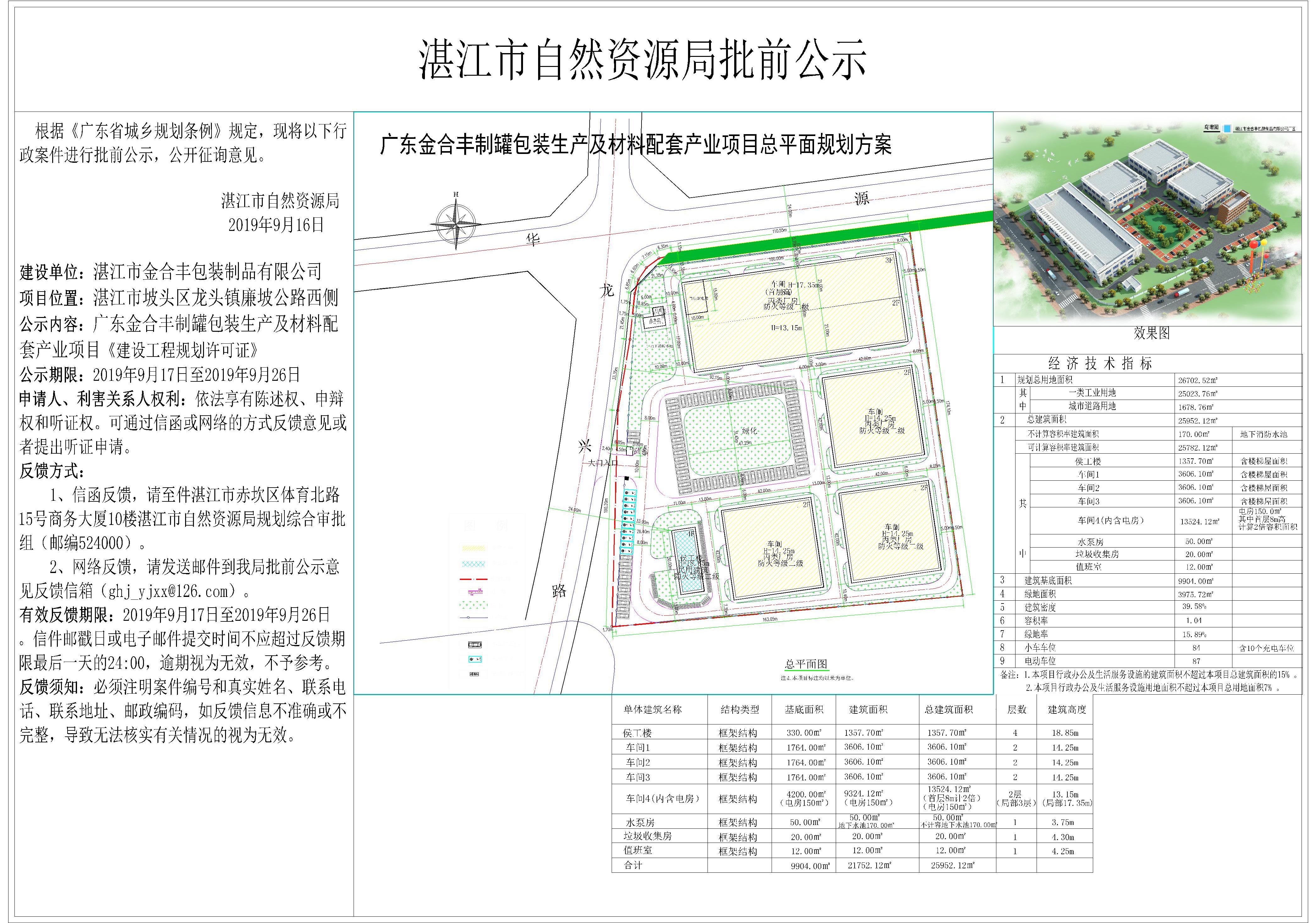 广东金合丰制罐包装生产及材料配套产业项目《建设工程规划许可证》批前公示
