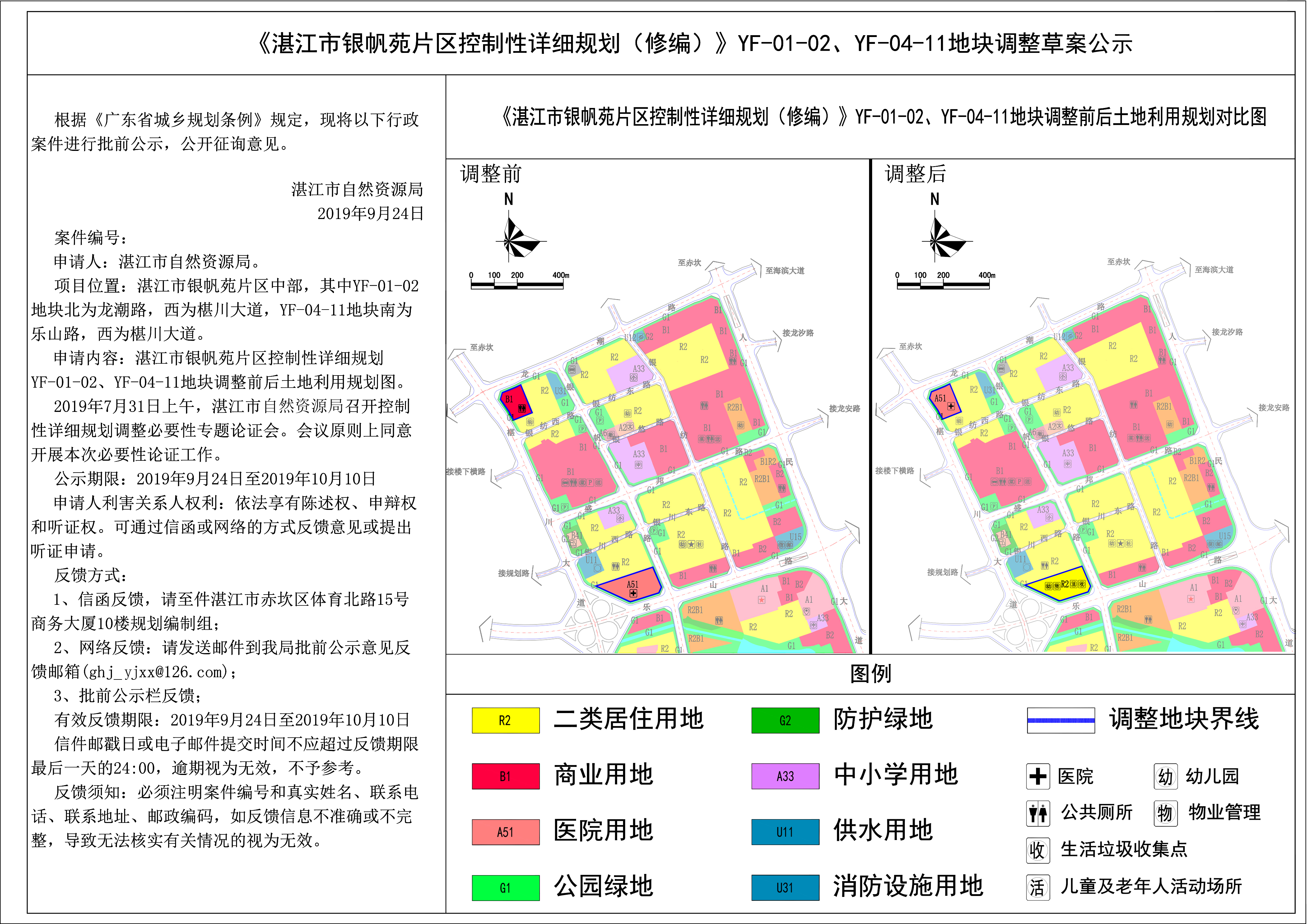 《湛江市银帆苑片区控制性详细规划(修编)》YF-01-02、YF-04-11地块调整前后土地利用规划对比图批前公示