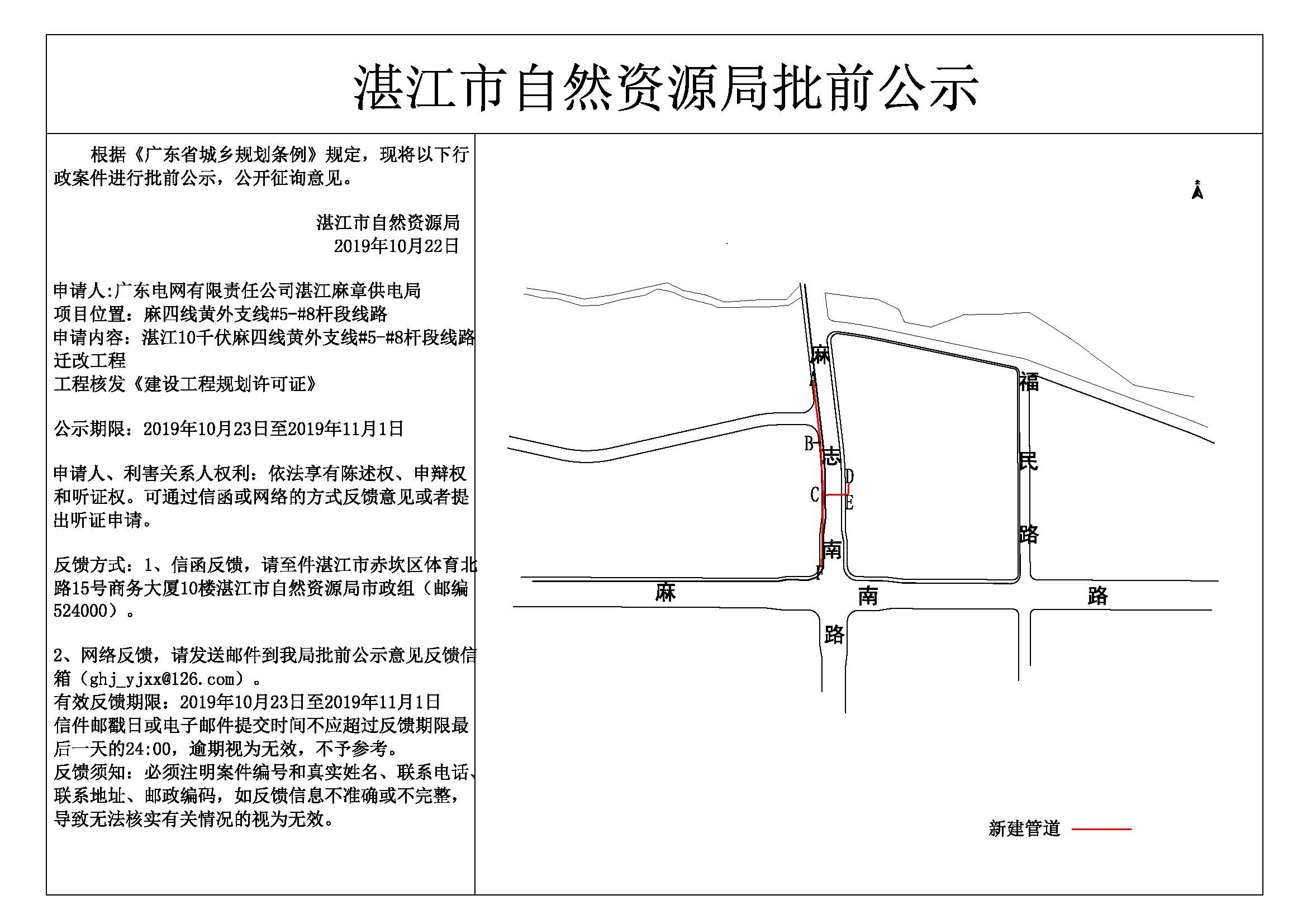 湛江10千伏麻四线黄外支线#5-#8杆段线路迁改工程核发《建设工程规划许可证》批前公示