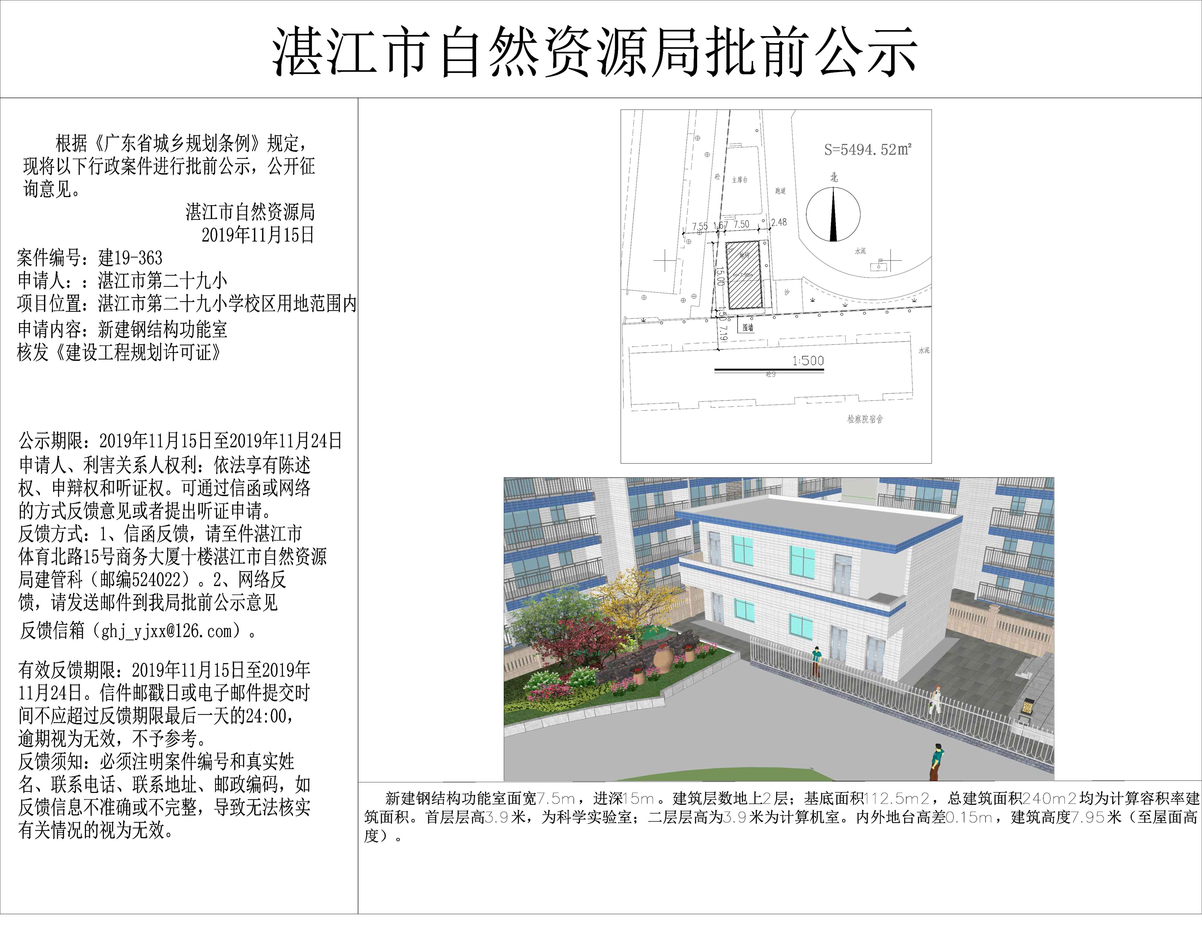 (湛江市第二十九小学)新建钢结构功能室核发《建设工程规划许可证》批前公示