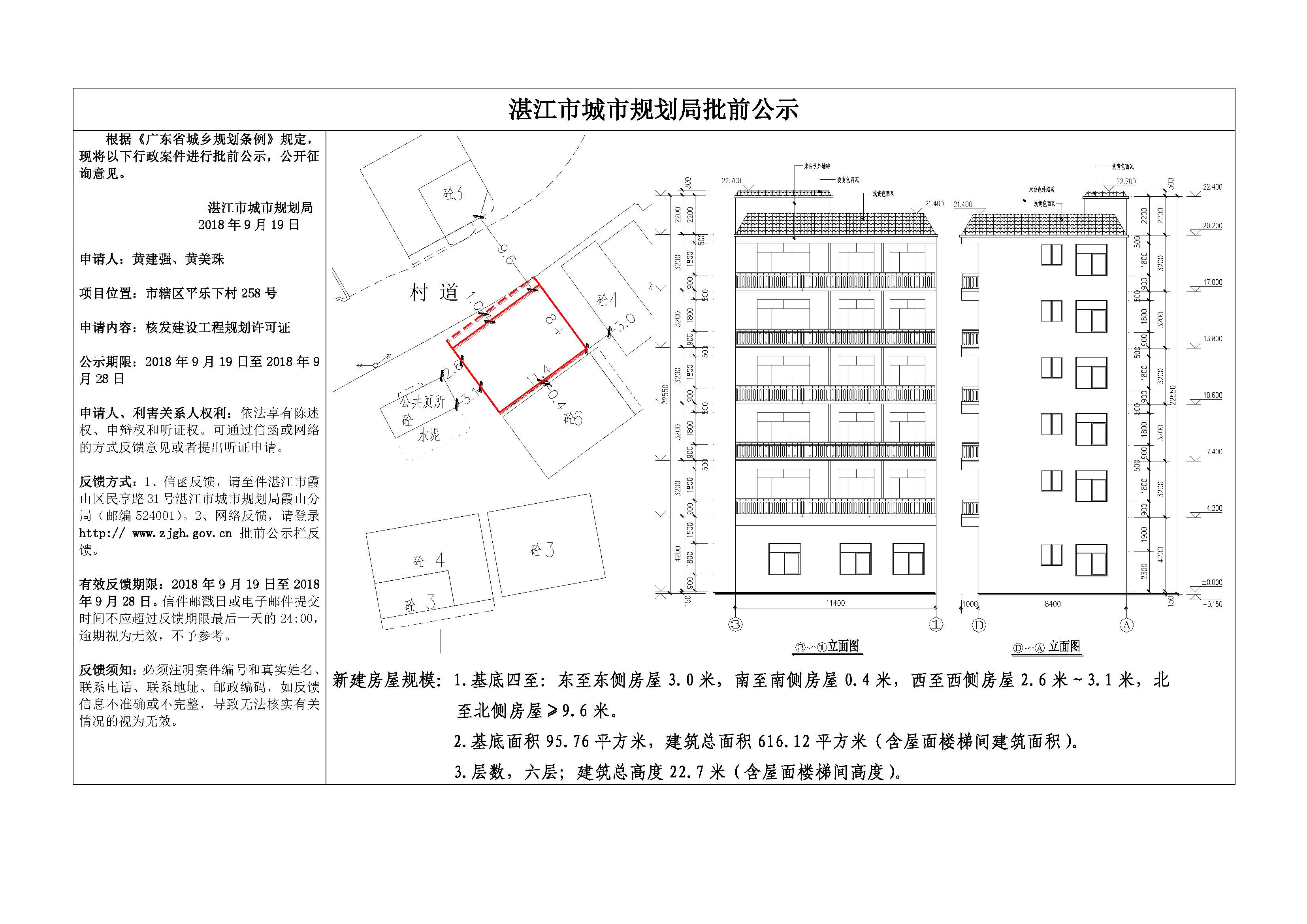 核发建设工程规划许可证批前公示(市辖区平乐西村258号,黄建强、黄美珠)