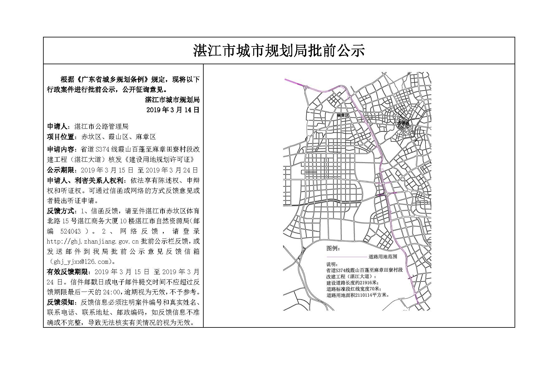 省道S374线霞山百蓬至麻章田寮村段改建工程(湛江大道)核发《建设用地规划许可证》批前公示