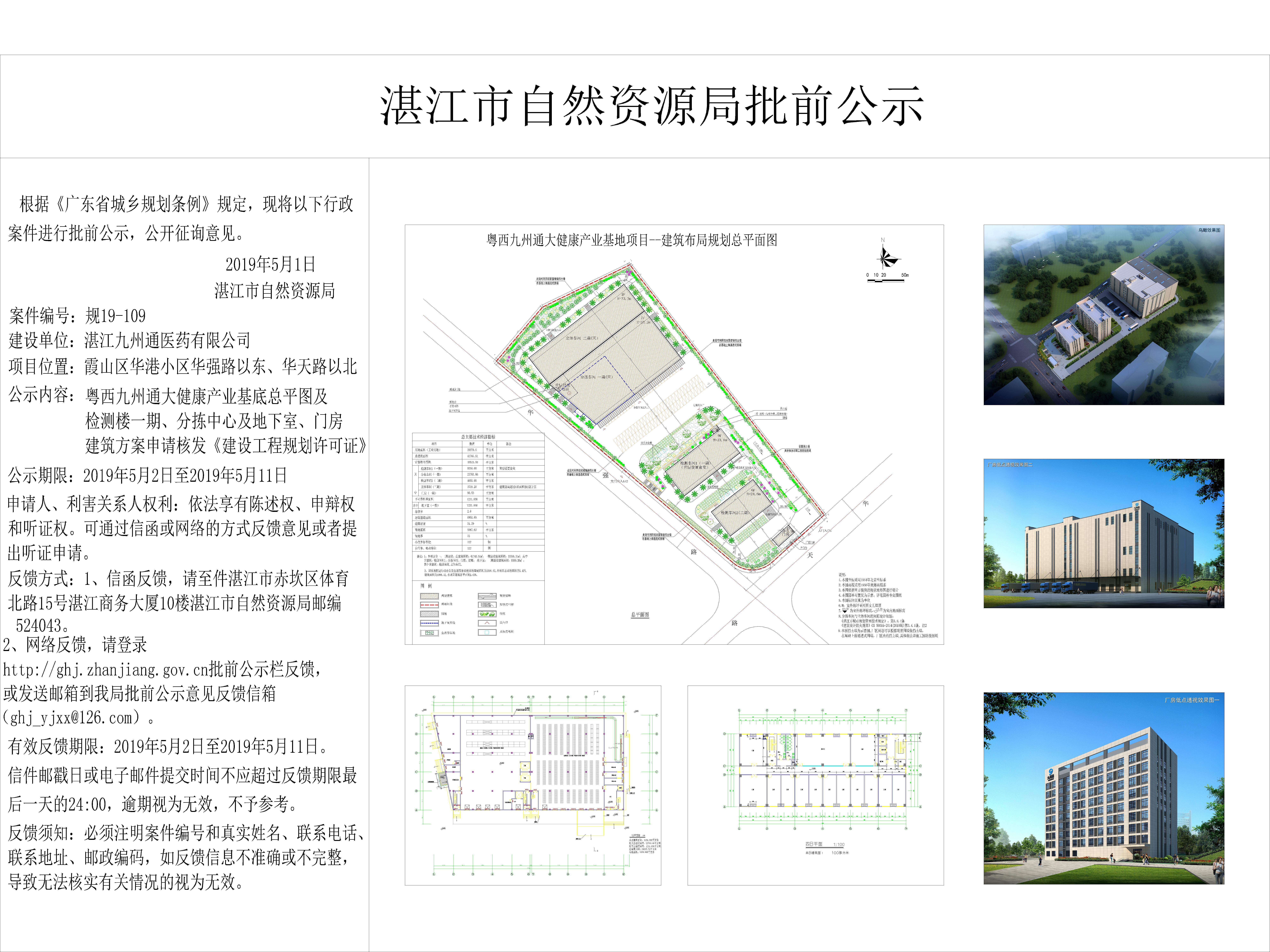 粤西九州通大健康产业基底总平图及检测楼一期、分拣中心及地下室、门房建筑方案申请核发《建设工程规划许可证》批前公示