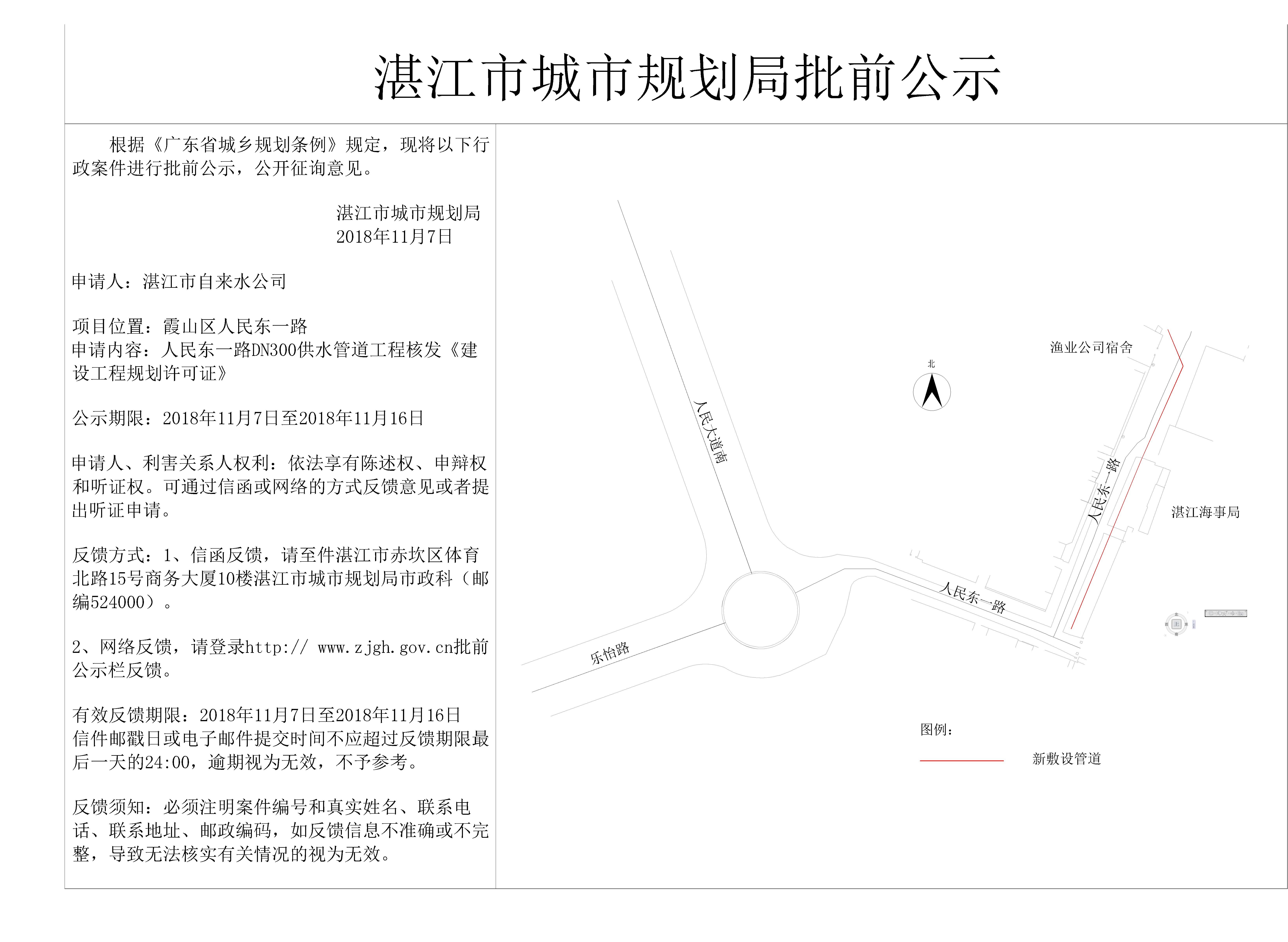 人民东一路DN300供水管道工程核发《建设工程规划许可证》批前公示