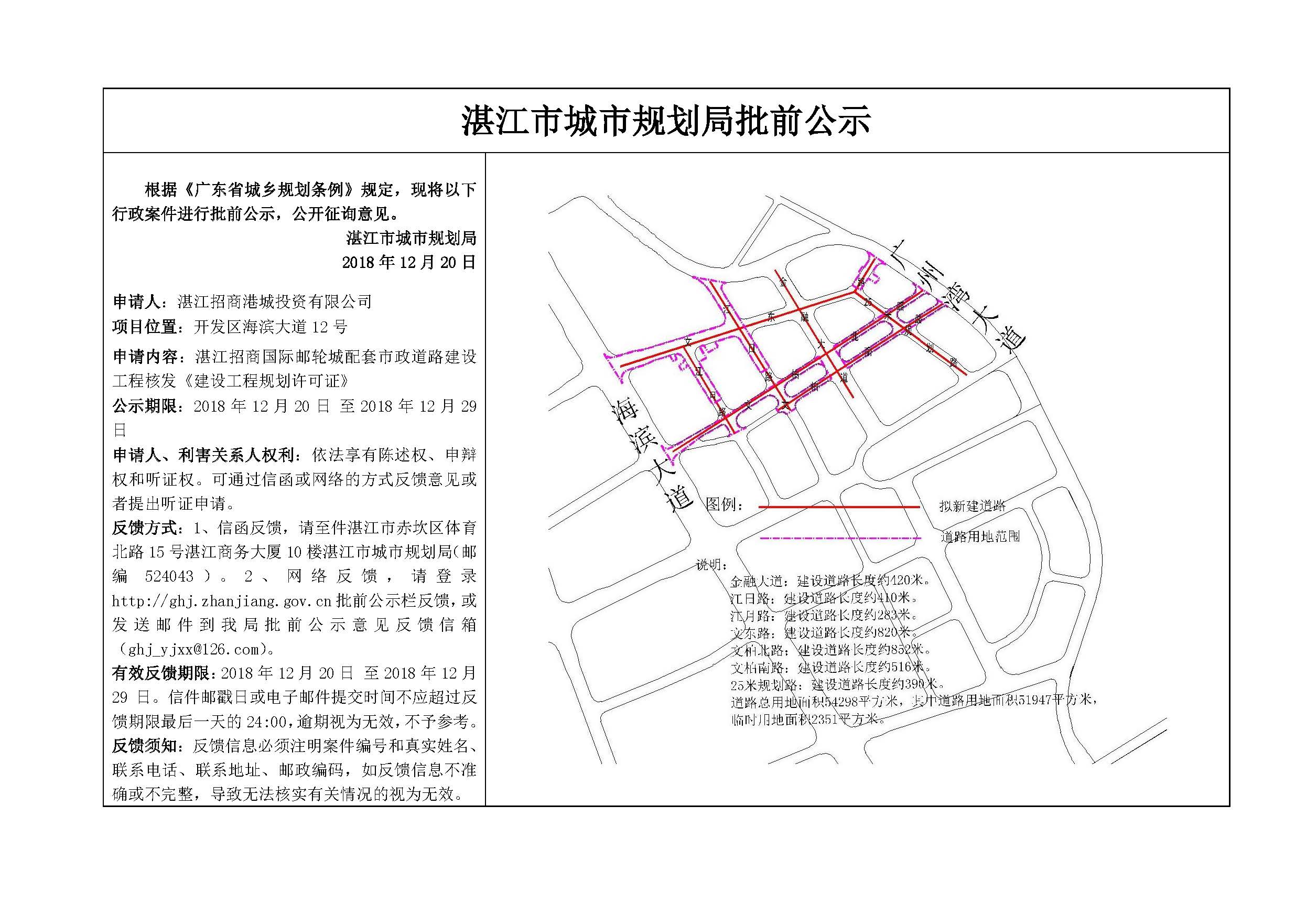 湛江招商国际邮轮城配套市政道路建设工程核发《建设工程规划许可证》批前公示