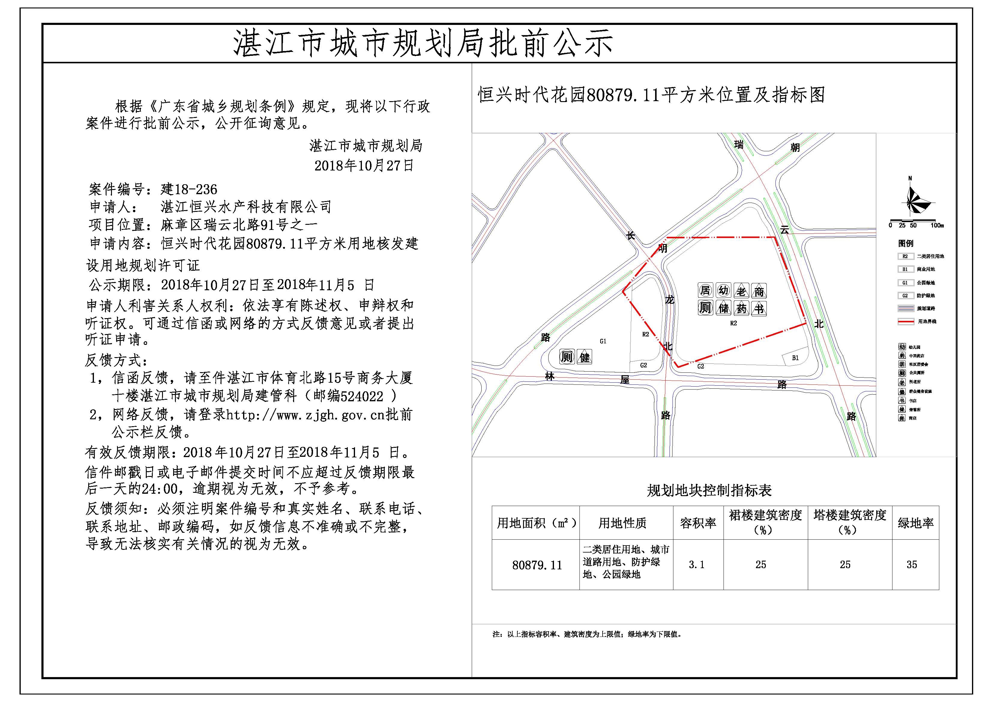 恒兴时代花园80879.11平方米用地核发建设用地规划许可证批前公示
