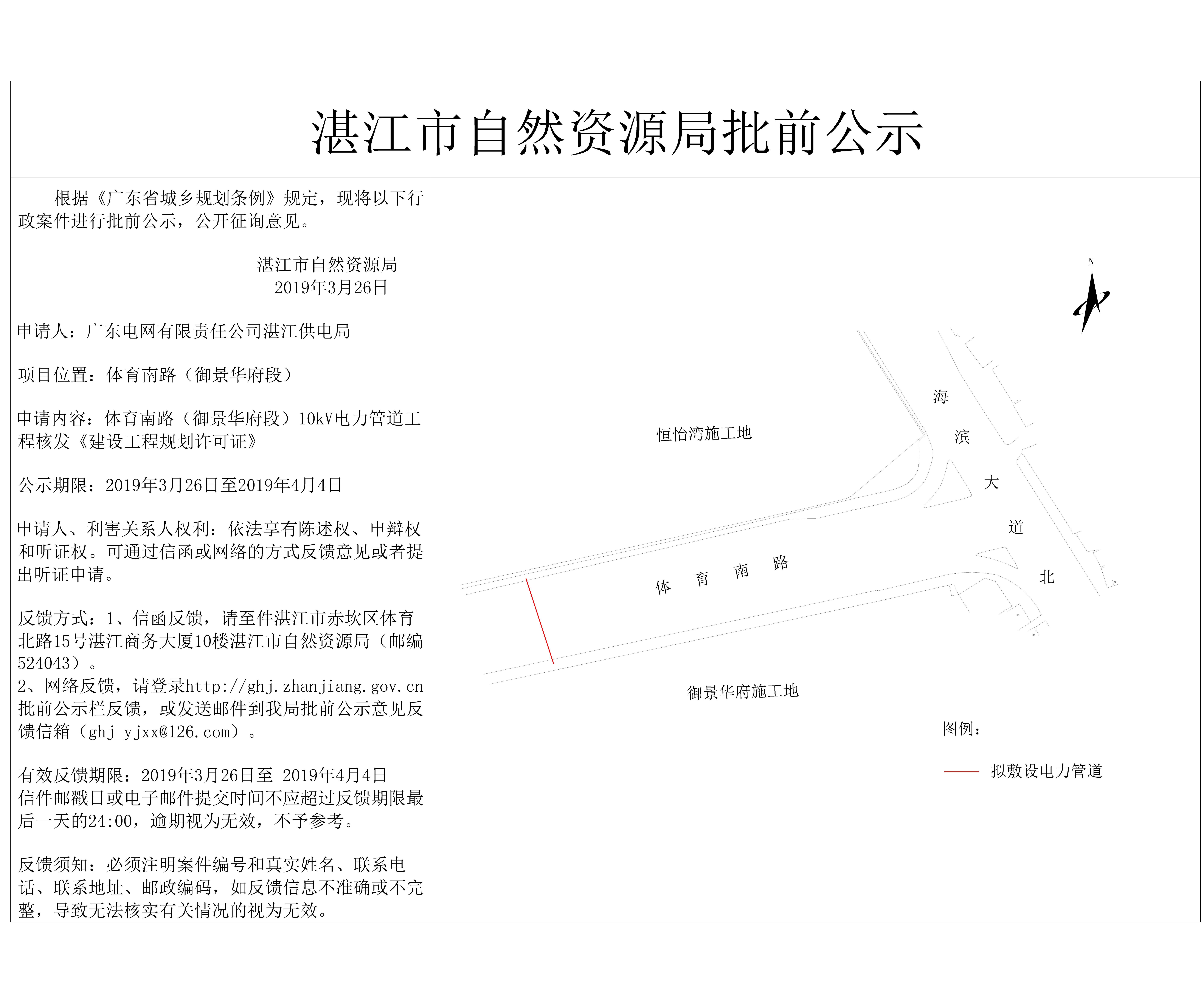 体育南路(御景华府段)10kv电力管道工程核发《建设工程规划许可证》批前公示