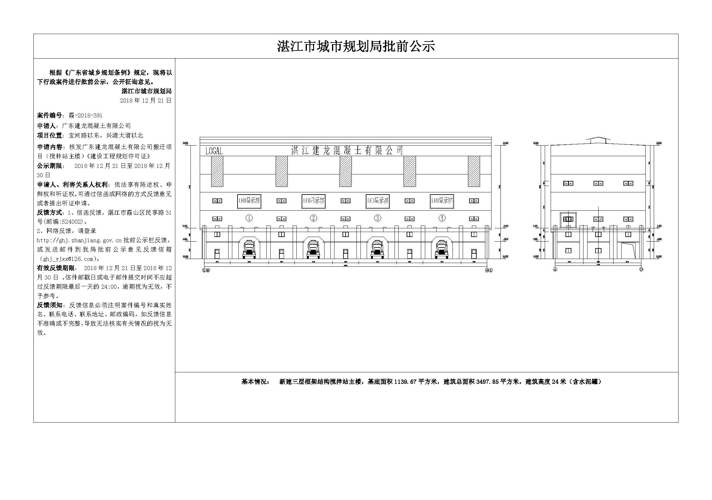 核发广东建龙混凝土有限公司搬迁项目(搅拌站主楼)《建设工程规划许可证》批前公示