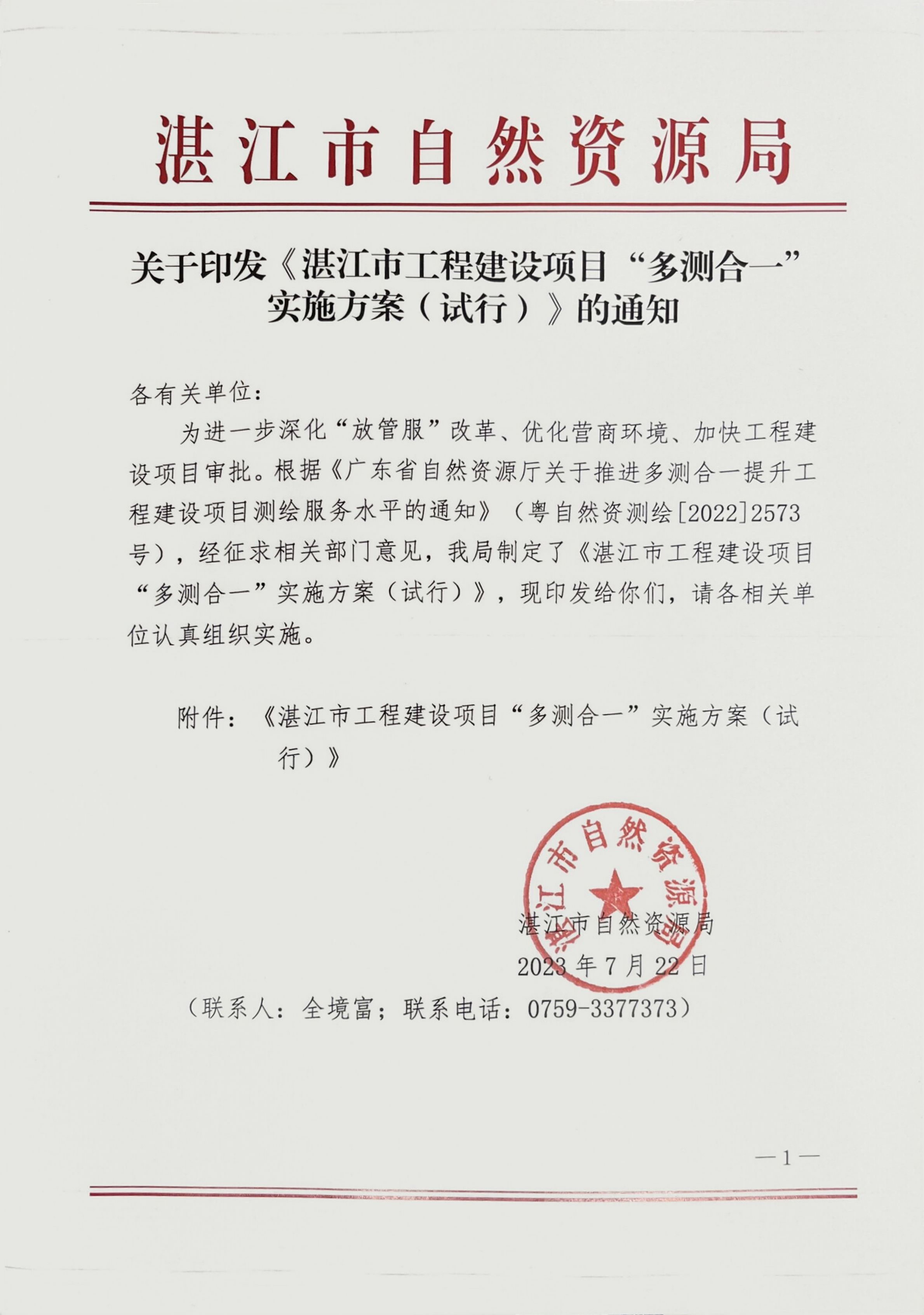 关于印发《湛江市工程建设项目“多测合一”实施方案(试行)》的通知