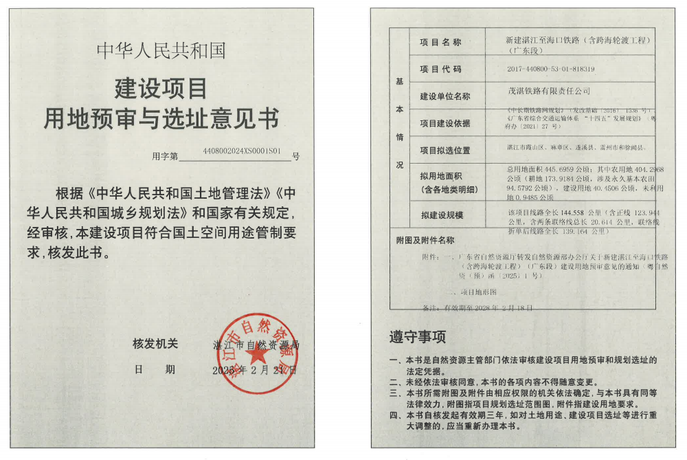 新建湛江至海口铁路(含跨海轮渡工程)(广东段)用地预审与选址意见书
