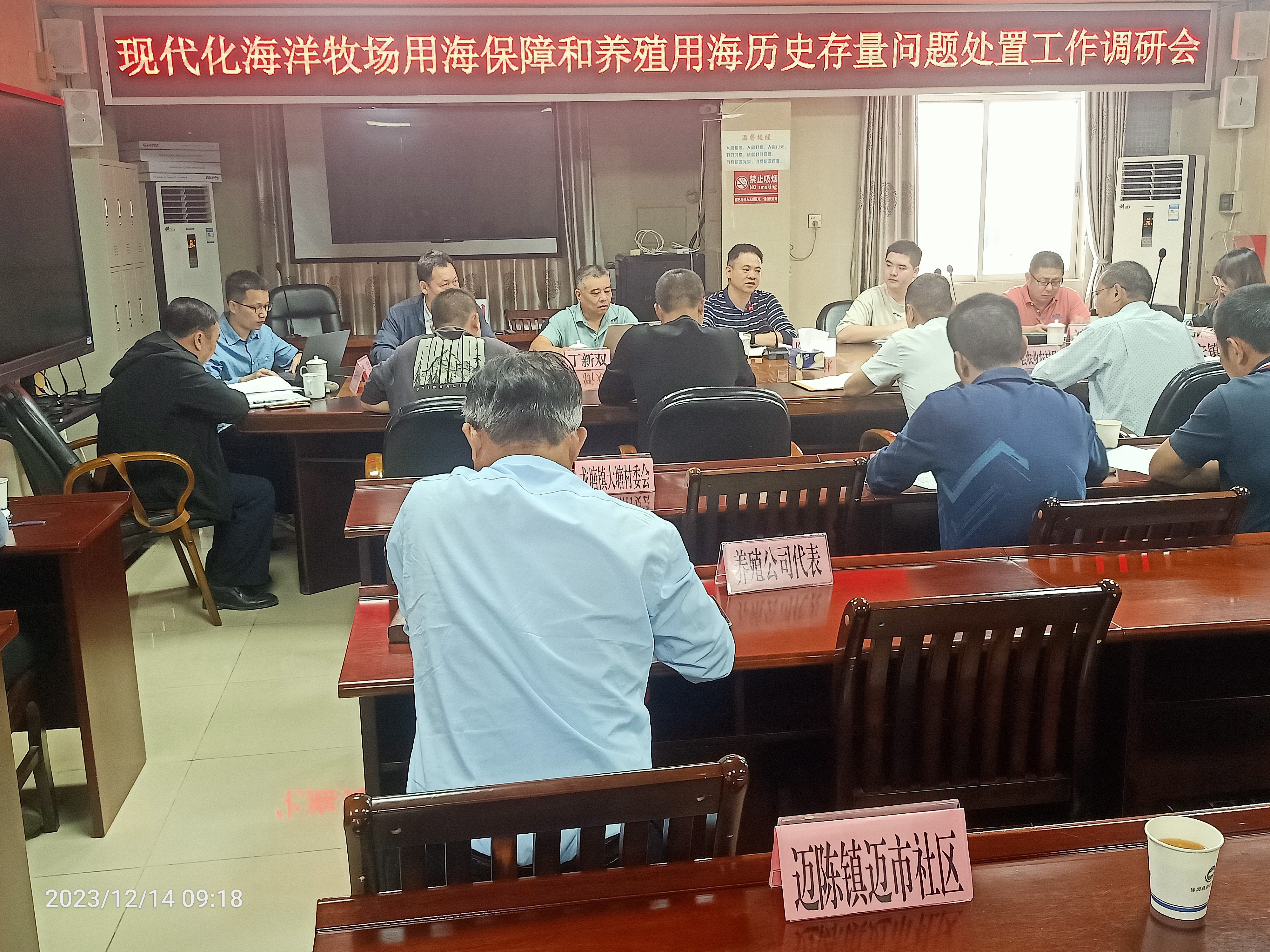 12月14日上午,省自然资源厅海域海岛管理处副处长陈琳率调研组到徐闻以召开座谈会的形式调研现代化海洋牧场用海保障和养殖用海历史存量问题处置工作,听取大家对现代化海洋牧场用海保障和养殖用海历史存量问题处置工作提出的意见建议,为广东下一步制定出台“疏近用远、科学布局”用海政策提供决策参考。省自然资源厅、省土地调查规划院、省海洋发展规划研究中心、湛江市自然资源局、湛江市农业农村局、徐闻县自然资源局、徐闻县农业农村局有关人员及和安、龙塘、迈陈、西连镇分管规划工作领导,养殖公司及养殖户代参加座谈。