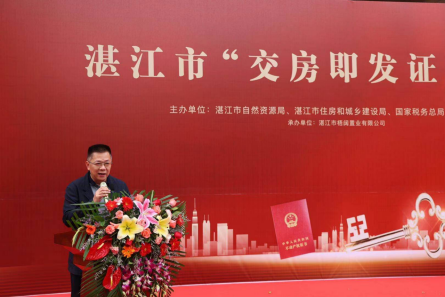 2021年1月25日上午,湛江市新建商品房“交房即交证”启动仪式在御景华府住宅小区举行,湛江市自然资源局党组书记、局长吴松江、湛江市税务局党委副书记(主持全面工作)、广东省税务局第四税务分局副局长(主持全面工作) 蒙全忠、湛江市住房和城乡建设局副局长莫大成等单位相关领导参加仪式。