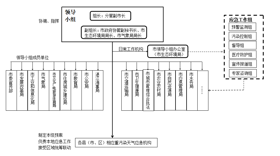 市人民政府成立湛江市重污染天气应急工作领导小组(简称“市领导小组”),负责统一领导、指挥和协调全市重污染天气应急工作。