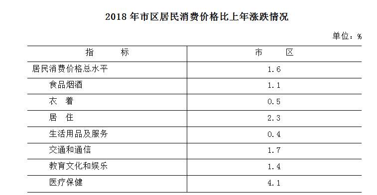 全年市区居民消费价格比上年上涨1.6%。分类别看,食品烟酒类价格上涨1.1%;衣着类价格上涨0.5%;居住类价格上涨2.3%;生活用品及服务类价格上涨0.4%;交通和通信类价格上涨1.7%;教育文化和娱乐类上涨1.4%;医疗保健类价格上涨4.1%;其他用品和服务价格上涨0.8%。