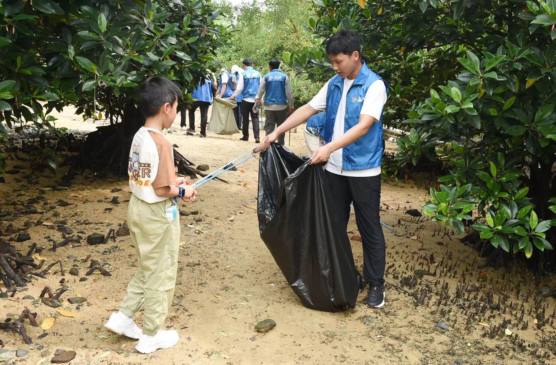 志愿者们沿着红树林滩涂清理垃圾。 本报记者殷翊展 摄