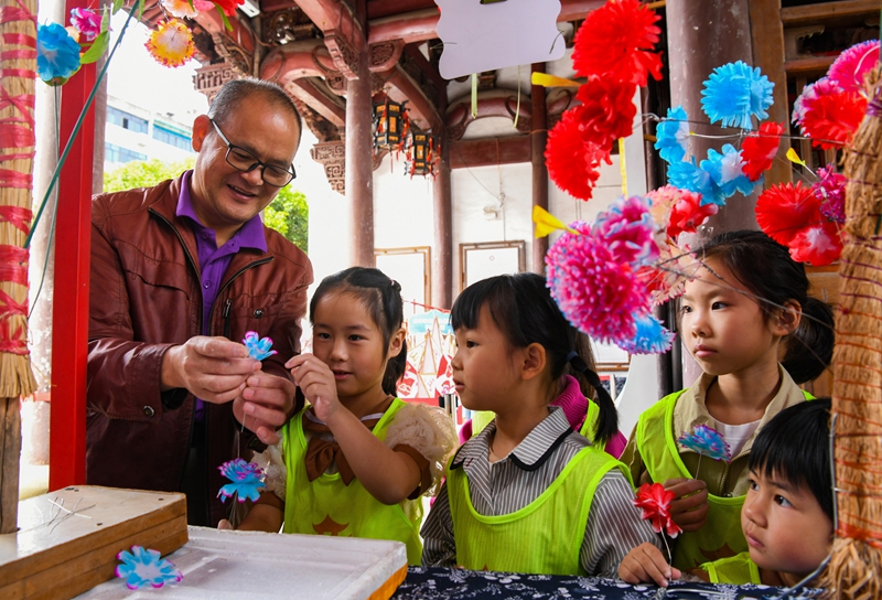 10月4日,在浙江省金华府城隍庙,小朋友观看手工艺人制作纸花。新华社发(时宽兵 摄)