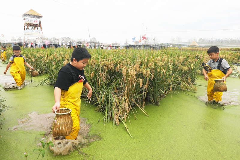 10月3日,孩子们在浙江省义乌市赤岸镇一处稻鱼共生的稻田里捉鱼。新华社发(龚献明 摄)