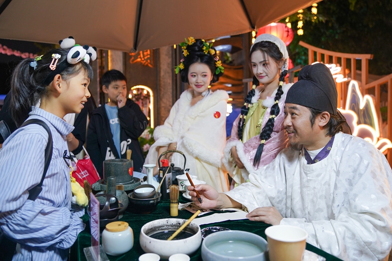 10月4日,在四川省成都市东门码头,夜游锦江项目推出的“锦夜庆华诞·璀璨耀蓉城”国庆系列主题活动上,“李白”(右)与小朋友互动对诗。新华社记者 胥冰洁 摄