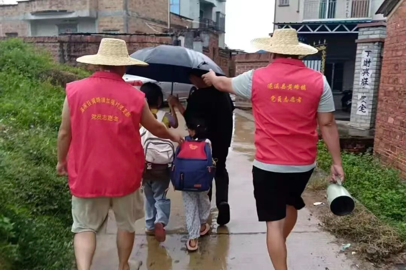 坡头党员干部将在风雨中前行的老奶奶与孩童护送回家。