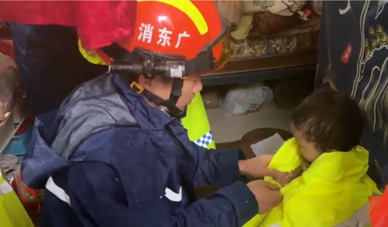 10月5日中午12时,湛江市消防救援支队119指挥中心接到报警,雷州市雷城街道镇中西路一民房铁皮屋顶被台风掀翻,有4人急需转移。消防救援人员第一时间赶赴现场,顶着狂风暴雨寻找被困人员所在位置,经过排查最终发现1名母亲与3名儿童,消防员随即为被困群众穿上雨衣,采用环抱式救援将被困儿童转移至安全区域。