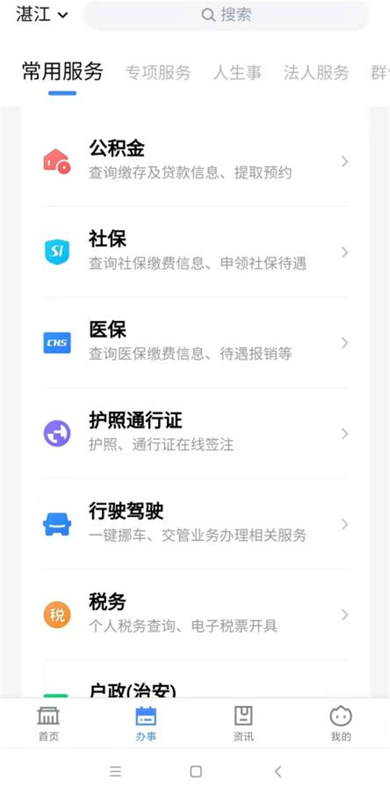 在“粤省事”主页 ,选择“办事”,点击“i湛江”进入湛江服务大厅。