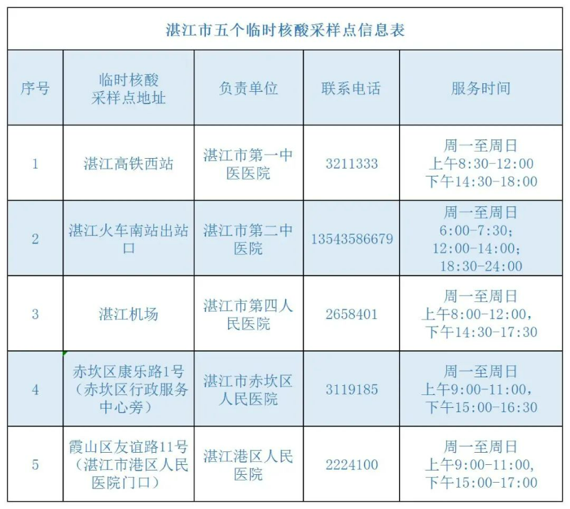针对近期国内局部地区发生聚集性疫情复杂形势,根据市疫情防控指挥部的统一部署,结合目前疫情防控形势实际需求,为做好国内中高风险地区来湛返湛人员核酸检测工作,切实落实“早发现、早报告、早隔离、早治疗”等疫情防控工作措施,从8月19日起,我市在湛江高铁西站、湛江火车南站、湛江机场分别设置一个核酸检测采样点,专门对国内中高风险地区所在城市来(返)湛人员开展落地核酸检测(持有 48 小时核酸检测结果的人员可无需落地检测);在赤坎区、霞山区各设立一个核酸检测采样点,专门为国内中高风险地区所在城市来(返)湛人员提供核酸检测采样服务。